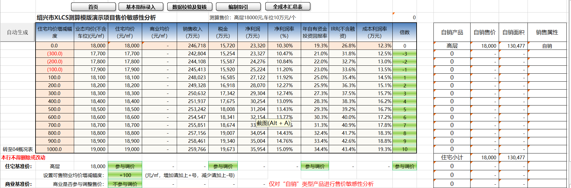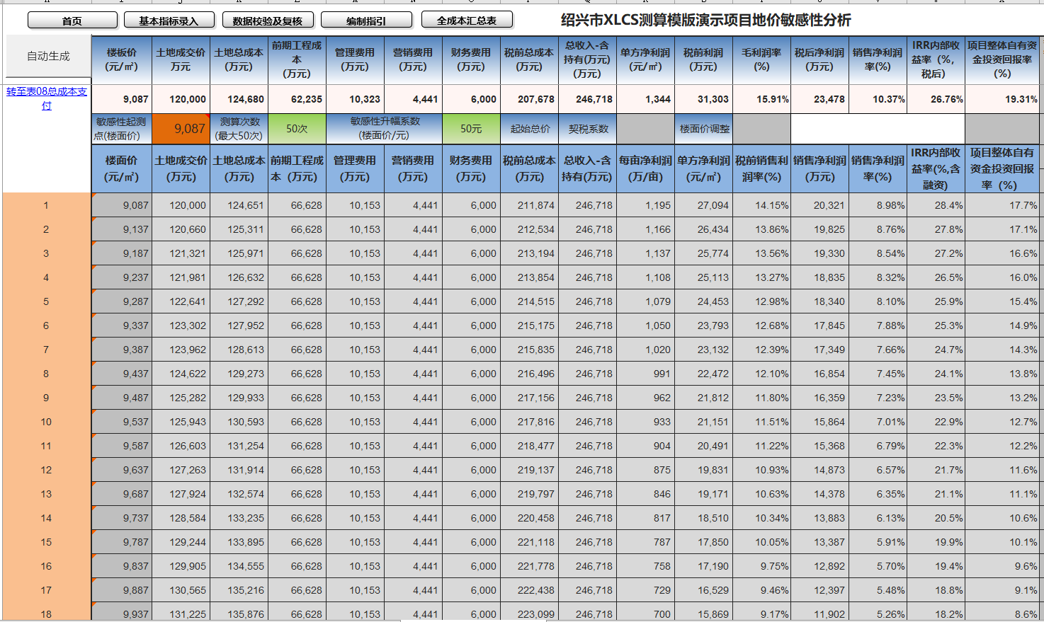 产品说明:《XLCS房产项目全成本测算模板》根据西南绿城项目拓展特点,借鉴了绿城、融创、碧桂园、金科、中梁、彰泰等大型房企的全成本测算模板优点和特色,取长补短,结合绿城产品类型的配置标准、常规项目的预设条件,整合编制的一套全智能化的全成本动态测算模板。只需输入项目的关键性和地方性指标,即可自动输出全套工程、销售、融资、税务、现金流、运营表格。常规需要成本专业人员在工程/销售/财务等部门配合下几天时间才能完成的房产项目全成本动态测算表格,现在即使小白也能在十分钟内完成。整套模版含90多个工作表,涵盖房地产项目测算的所有静态/动态测算分析图表。